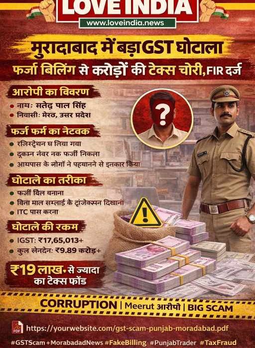 लव इंडिया, मुरादाबाद। थाना कोतवाली क्षेत्र में जीएसटी विभाग की जांच के बाद एक बड़ा टैक्स फ्रॉड सामने आया है। यह मामला फर्जी फर्म बनाकर इनपुट टैक्स क्रेडिट (ITC) लेने से जुड़ा है। 👤 आरोपी का विवरण नाम: मो. अताउर रहमाननिवासी: मेरठ, उत्तर प्रदेशफर्म: रहमान इंटरप्राइजेज 🏢 फर्जी फर्म का खेल जांच में सामने आया…