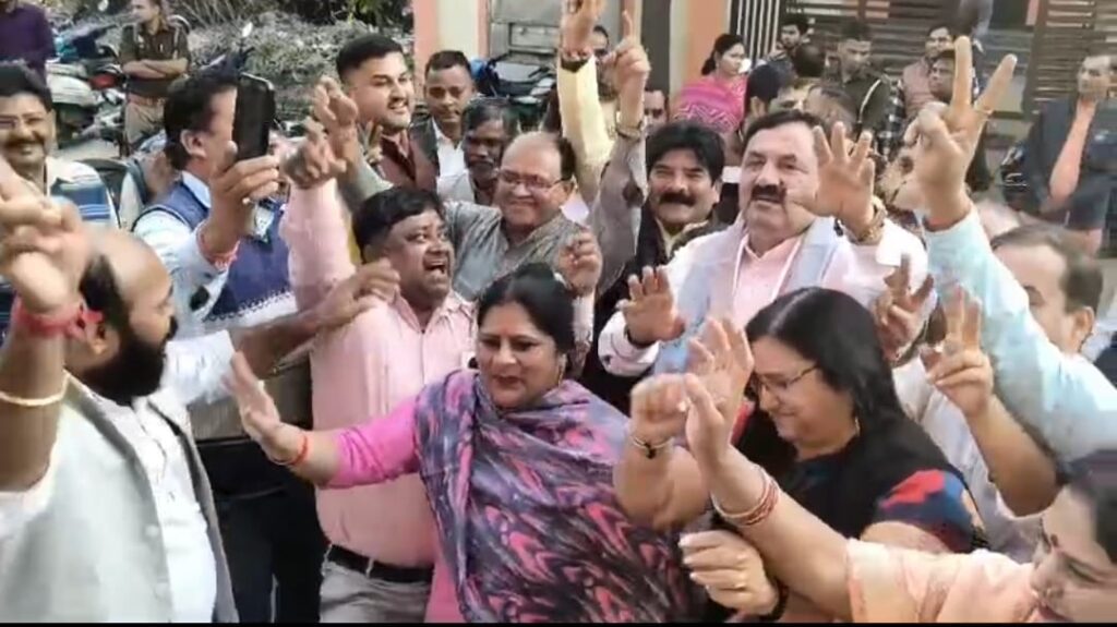 भारतीय जनता पार्टी महानगर के तत्वाधान में महानगर अध्यक्ष गिरीश भंडूला के नेतृत्व में महानगर कार्यालय बुद्धि विहार पर बिहार प्रदेश में यशस्वी प्रधानमंत्री नरेंद्र मोदी के नेतृत्व में मिली प्रचंड जीत की खुशी में ढोल नगाड़ों की थाप पर नाच गाकर खुशी मनाई इस प्रचण्ड जीत की सभी कार्यकर्ताओं ने एक दूसरे को बधाई एवं शुभकामनाएं दी एवं एक दूसरे को लड्डू खिलाकर खुशी मनाई महानगर अध्यक्ष गिरीश भंडूला जिला अध्यक्ष आकाश कुमार पाल एवं सभी ने ने पिछड़ा वर्ग आयोग उपाध्यक्ष सूर्य प्रकाश पाल का लड्डू खिलाकर इस प्रचण्ड जीत की बधाई दी एवं सभी कार्यकर्ताओं को शुभकामनाएं दी ।