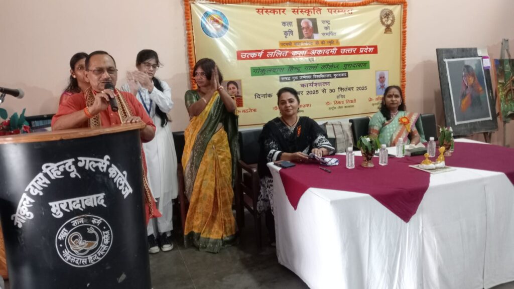 लव इंडिया मुरादाबाद। गोकुलदास हिंदू गर्ल्स कॉलेज, मुरादाबाद में चित्रकला विभाग एवं गृह विज्ञान विभाग के संयुक्त तत्वावधान तथा उत्कर्ष ललित कला अकादमी के सहयोग से चल रही 15 दिवसीय चित्रण कार्यशाला का समापन आज सांस्कृतिक कार्यक्रम के साथ हुआ।