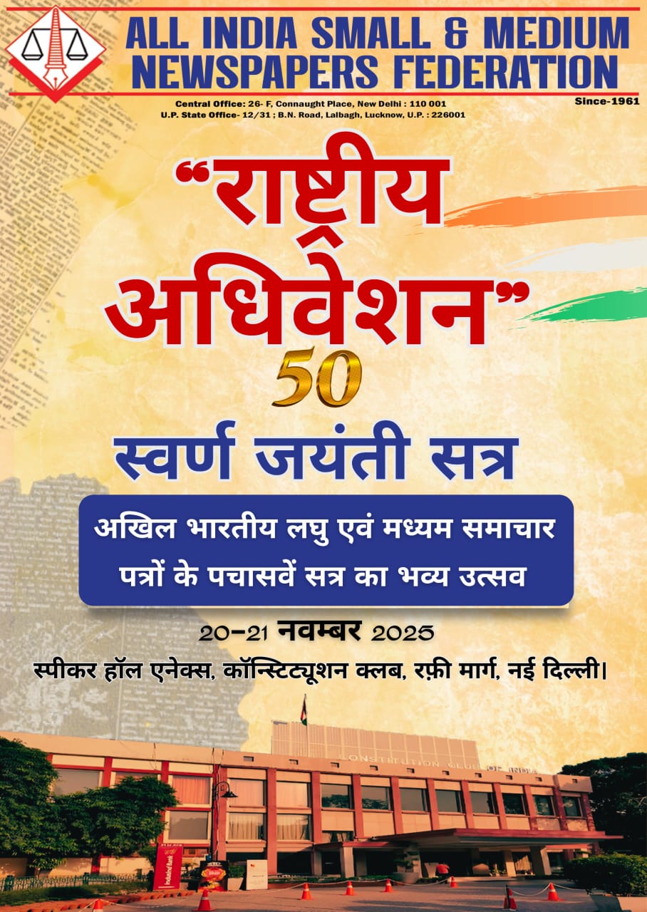 लव इंडिया नई दिल्ली। ऑल इंडिया स्मॉल एवं मीडियम न्यूजपेपर फेडरेशन (AISMNF) का दो‑दिवसीय गोल्डन जुबली सेलिब्रेशन इस साल 20 और 21 नवंबर को दिल्ली के संसद भवन के पास स्थित कांस्टीट्यूशन क्लब में आयोजित होने जा रहा है। इस अवसर पर राष्ट्रीय और प्रांतीय स्तर के अध्यक्षों का चुनाव भी होगा, साथ ही मीडिया की भूमिका और उसकी जिम्मेदारियों पर एक राष्ट्र‑स्तरीय चर्चा भी आयोजित की जाएगी।