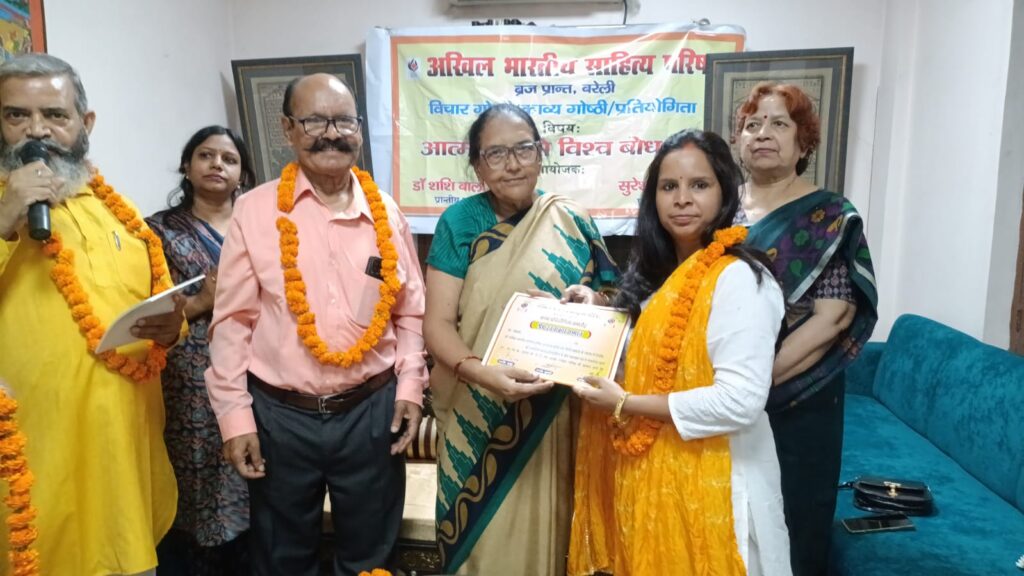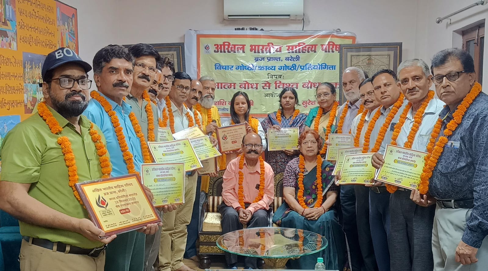 बरेली। अखिल भारतीय साहित्य परिषद ब्रज प्रांत बरेली द्वारा हिंदी पखवाड़े के उपलक्ष्य हुई काव्य प्रतियोगिता में परिषद से जुड़े बाईस साहित्यकारों ने प्रतिभाग किया और अपनी अपनी रचनाएं प्रस्तुत की। शील ग्रुप के सिटी सभागार में हिंदी उन्नयन के लिए किए गए काव्य प्रतियोगिता की अध्यक्षता प्रांतीय अध्यक्ष डॉ सुरेश बाबू मिश्रा ने की । कार्यक्रम का संचालन जनपद अध्यक्ष डॉ बृजेश कुमार शर्मा ने किया।