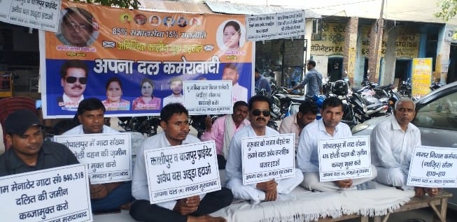 आज मण्डल अध्यक्ष डॉ.रामेश्वर दयाल तुरैहा के नेतृत्व में अपना दल कमेरावादी के पदाधिकारी/कार्यकर्ताओं ने जिलाधिकारी कार्यालय पर पुनः अनिश्चितकालीन भूख हड़ताल पर बैठकर गोपालपुर में स्थित गाटा संख्या 476 होली दहन की जमीन, ग्राम मैनाठेर में स्थित गाटा संख्या 840 व 518 की दलित की जमीन,ग्राम लांकडी फ़ाज़लपुर में गाटा संख्या 2115 में 5767.89 वर्ग मीटर भूमि,गाटा संख्या 3807/20 रकवा 0.2590 हे0,2807/48 रकवा 0.2830 हे0 व 90 एकड़ जमीन को कब्जामुक्त कराने,आर.आर.एंटरप्राइजेज द्वारा घूस लेकर 632 सफाई कर्मचारी रखे जाने की जाँच कराने,मंगल बाजार व गुरुवार को दिल्ली रोड गागन चौराहे पर लगने वाला अवैध साप्ताहिक बाजार,महानगर के बीचोबीच स्थित काशीपुर व बाजपुर प्राइवेट अवैध बस अड्डा,रेलवे स्टेशन से इंपीरियल तिराहा तक दोनों साइड का अतिक्रमण हटवाने की माँग की।