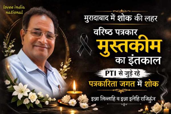 ✍️उमेश लव, लव इंडिया, मुरादाबाद। मुरादाबाद के वरिष्ठ पत्रकार और प्रेस ट्रस्ट ऑफ इंडिया (PTI) से जुड़े पत्रकार मोहम्मद मुस्तकीम का शुक्रवार शाम इंतकाल हो गया। उनके निधन की खबर से शहर के पत्रकारिता जगत और सामाजिक क्षेत्रों में शोक की लहर दौड़ गई। बताया जा रहा है कि उनका जनाजा शनिवार सुबह सुपुर्द-ए-खाक किया…