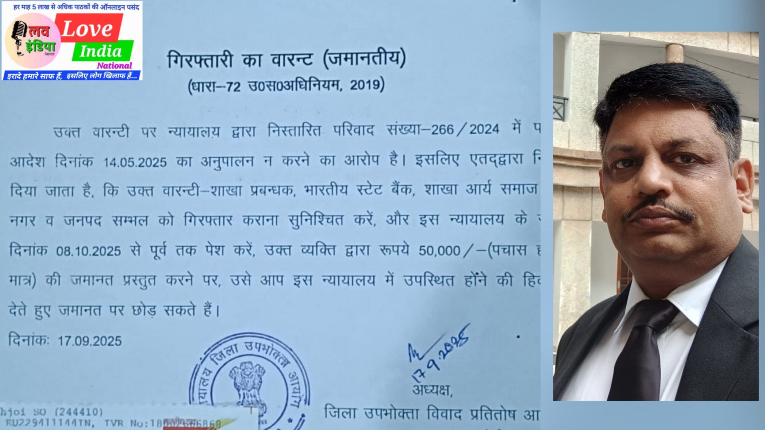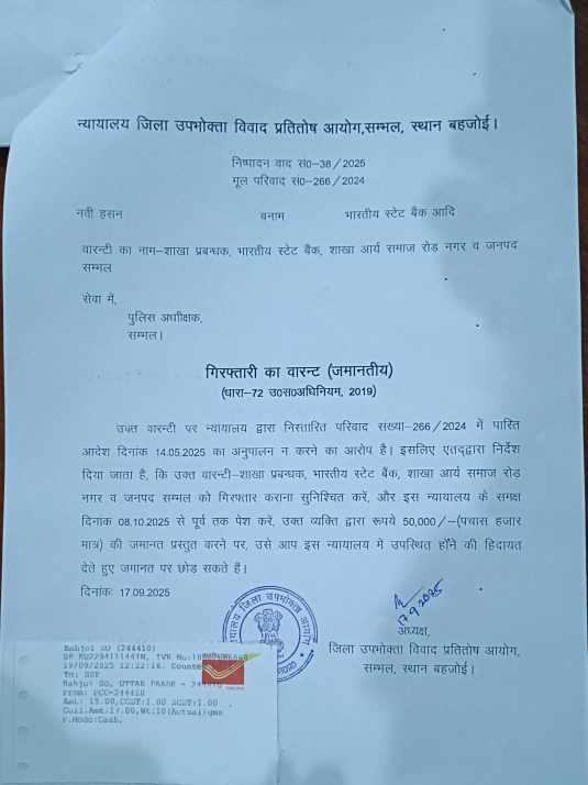 आयोग के आदेश की अवहेलना करने पर अधिवक्ता लवमोहन वार्ष्णेय द्वारा आयोग को बताया कि इस आदेश का अनुपालन बैंक द्वारा नहीं किया जा रहा है आयोग ने पुनः बैंक को तलब किया परन्तु कोई संतोष जनक जवाब न देने पर भारतीय स्टेट बैंक संभल के शाखा प्रबंधक व बैंक के चेयरमैन के विरुद्ध जमानतीय वारंट जारी किए गए हैं।