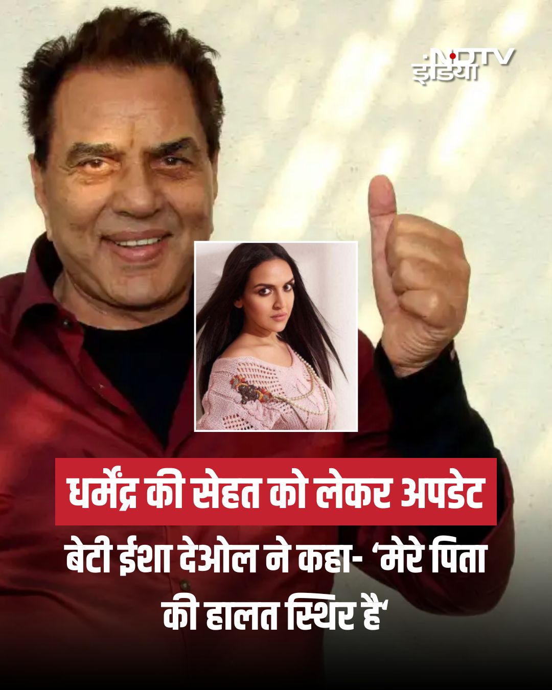 ईशा देओल ने अपने इंस्टाग्राम स्टोरी में लिखा, “मीडिया पूरी तरह गलत खबरें फैला रहा है। पापा की हालत स्थिर है और वे रिकवर कर रहे हैं। हम सभी से निवेदन करते हैं कि हमारे परिवार की प्राइवेसी का सम्मान करें। पापा की जल्दी सेहतमंदी के लिए दुआ करने के लिए धन्यवाद।”