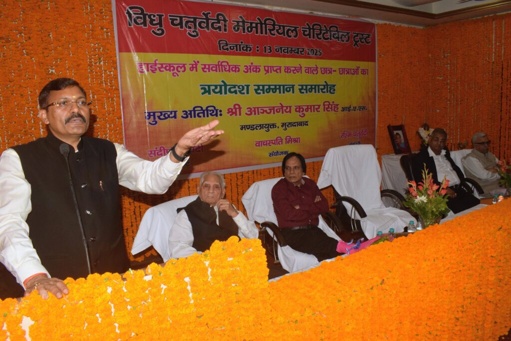 मण्डलायुक्त आन्जनेय कुमार सिंह आज आई.एम.ए. नयन में विधु चतुर्वेदी मैमोरियल चैरिटेबिल ट्रस्ट द्वारा आयोजित त्रयोदश प्रतिभा सम्मान समारोह में मुख्य अतिथि के रूप में विचार व्यक्त कर रहे थे। इस अवसर पर मुरादाबाद महानगर के यू० पी० बोर्ड के 58 विद्यालयों के 68 हाईस्कूल टापर्स को सम्मानित किया गया। मेधावियों को 3100/- रूपये का ड्राफ्ट, स्मृति चिन्ह एवं प्रमाण पत्र प्रदान किये गये। सम्मान पाकर मेधावियों के चेहरे पर मुस्कान झलक रही थी। उपस्थित जन समुदाय द्वारा जोरदार तालियों से मेधावियों का उत्साहवर्धन किया गया।