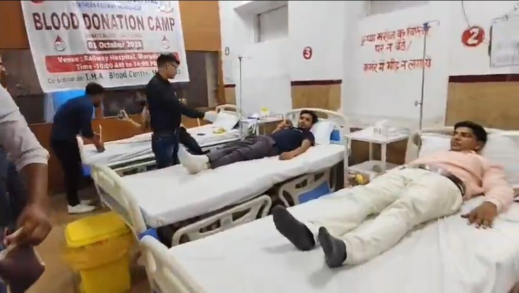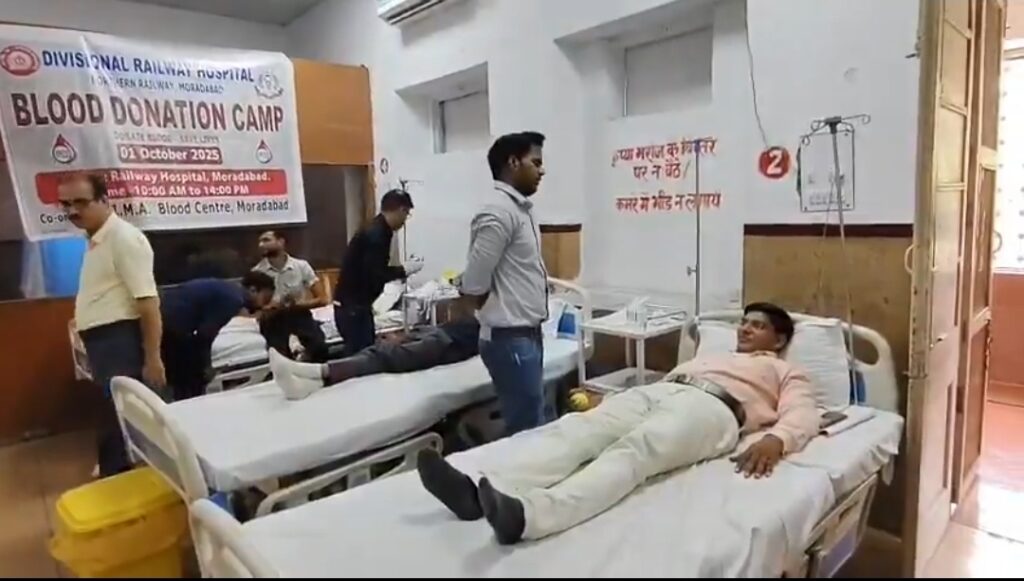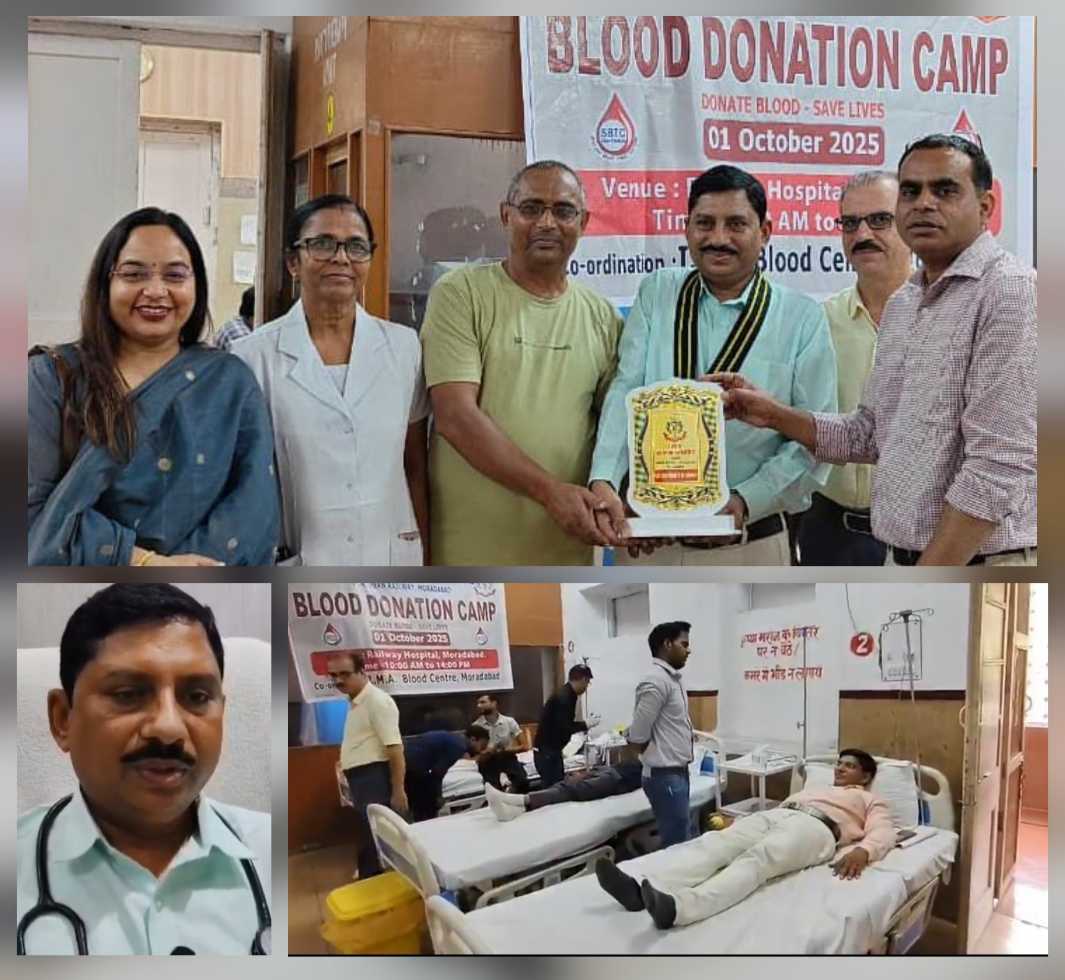 लव इंडिया, मुरादाबाद। इंडियन मेडिकल एसोसिएशन के नए पदाधिकारियों के कार्यकाल की शुरुआत के उपलक्ष्य में एक रक्तदान शिविर का आयोजन किया गया। इस शिविर में रेलवे अस्पताल के कर्मचारियों और अधिकारियों ने लगभग 35 यूनिट रक्तदान किया। यह शिविर आईएमए ब्लड बैंक, कचहरी रोड के सहयोग से डिवीजनल रेलवे हॉस्पिटल, मुरादाबाद में आयोजित किया गया था।