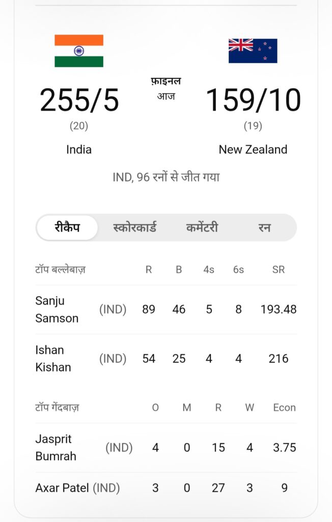फाइनल मुकाबले में भारतीय बल्लेबाजों ने आक्रामक बल्लेबाजी करते हुए बड़ा स्कोर खड़ा किया। इसके बाद गेंदबाजों ने भी शानदार प्रदर्शन करते हुए न्यूजीलैंड की पूरी टीम को लक्ष्य तक पहुंचने से पहले ही समेट दिया। भारतीय तेज गेंदबाजों और स्पिनरों की सटीक गेंदबाजी के सामने न्यूजीलैंड के बल्लेबाज ज्यादा देर टिक नहीं सके।