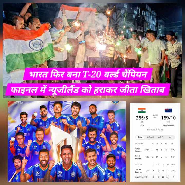 भारत ने फाइनल मुकाबले में न्यूजीलैंड को हराकर ICC Men’s T20 World Cup 2026 का खिताब अपने नाम कर लिया। रोमांचक फाइनल में भारतीय टीम ने शानदार प्रदर्शन करते हुए न्यूजीलैंड को बड़े अंतर से पराजित कर ट्रॉफी पर कब्जा जमा लिया।
