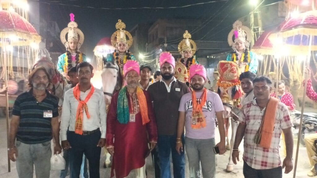 शोभायात्रा के एक सिंहासन पर अयोध्या के राजा दशरथ एक पर गुरु वशिष्ठ और ऋषि विश्वामित्र एक सिंहासन पर मां दुर्गा की झांकी अद्भुत छटा बिखेर रही थी, मां पार्वती के साथ भोलेनाथ अलग ही रंग बिखेर रहे थे और राधा रानी के साथ भगवान श्री कृष्णा बांसुरी बजा रहे थे बैंड बाजों के साथ राम भक्त नृत्य करते हुए चल रहे थे डीजे का तो अद्भुत ही रंग दिख रहा था हर कोई नृत्य करने के मूड में लग रहा था।