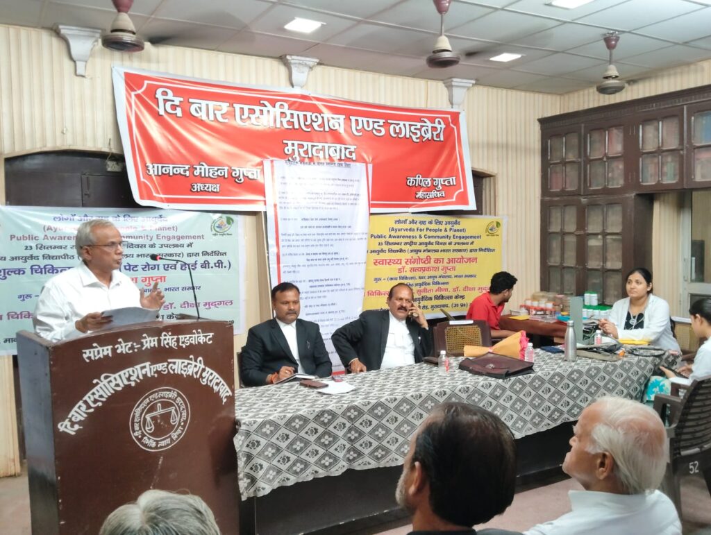 कार्यक्रम की अध्यक्षता दि बार एसोसिएशन एंड लाइब्रेरी मुरादाबाद के अध्यक्ष आनंद मोहन गुप्ता ने की। कार्यक्रम के मुख्य वक्ता वरिष्ठ आयुर्वेदिक चिकित्सक डॉक्टर एस पी गुप्ता रहे। कार्यक्रम का संचालन संयुक्त सचिव जितेंद्र प्रताप सिंह जेपी ने किया। कार्यक्रम में मुख्य वक्ता के रूप में बोलते हुए डॉक्टर सत्य प्रकाश गुप्ता ने आयुर्वेद का उद्देश्य बताते हुए कहा कि “प्रयोजनम च अस्य स्वस्थस्य स्वास्थ्य रक्षणम आतुरस्य विकार प्रशमनम च। आयुर्वेद का उद्देश्य स्वस्थ पुरुष के स्वास्थ्य की रक्षा करना और रोगी व्यक्ति के रोग को दूर करना है। अपने वक्तव्य में मुख्य वक्ता के द्वारा आयुर्वेद के लाभ व आयुर्वेद के द्वारा व्यक्ति के जीवन में सकारात्मक परिवर्तन पर प्रकाश डाला गया।