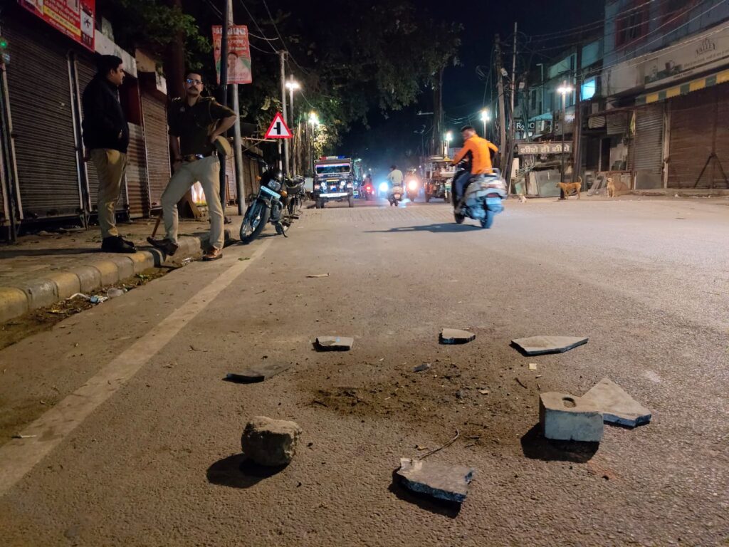 घटनास्थल पर एकत्र भीड़ से जानकारी करती पुलिस