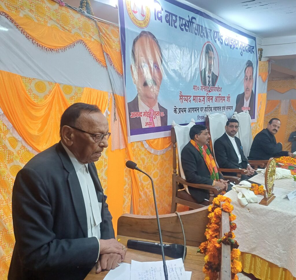 मुरादाबाद। द बार एसोसिएशन एंड लाइब्रेरी मुरादाबाद के एस.पी. गुप्ता भवन सभागार में शुक्रवार को माननीय जनपद न्यायाधीश सैयद माऊज़ बिन आसिम के प्रथम आगमन पर भव्य स्वागत एवं सम्मान समारोह आयोजित किया गया। अधिवक्ताओं ने अंगवस्त्र, फूलमाला और पुष्पगुच्छ भेंट कर उनका गर्मजोशी से स्वागत किया।