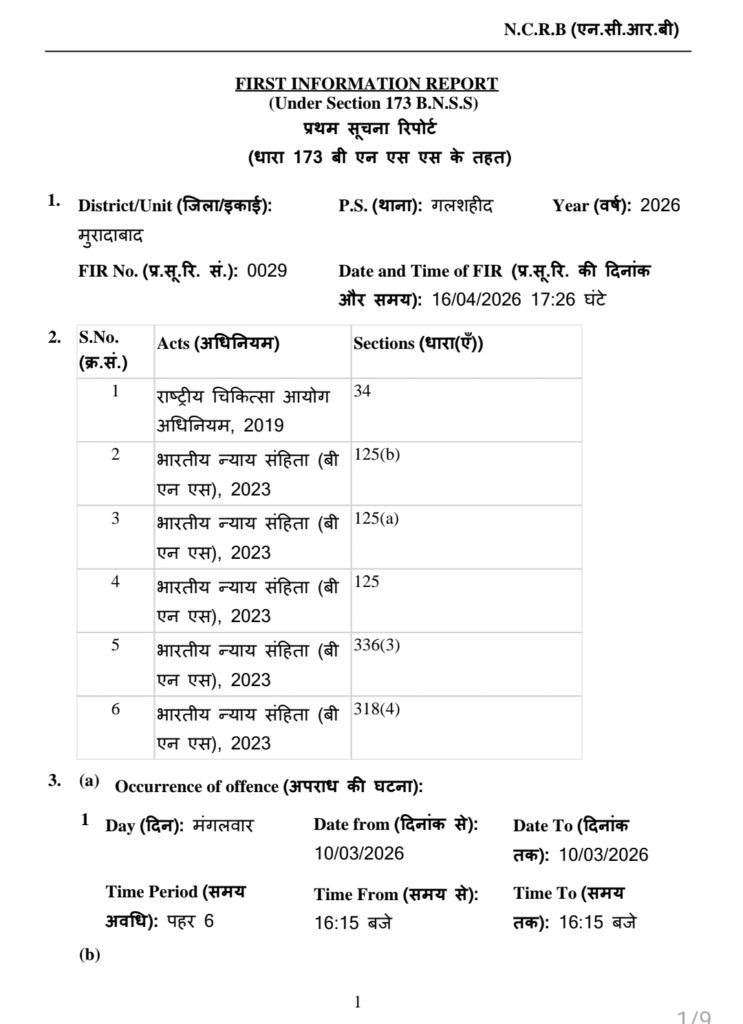 पुलिस ने आरोपी के खिलाफ भारतीय न्याय संहिता (BNS) की धारा 125, 336(3), 318(4) के अलावा अन्य कानून राष्ट्रीय चिकित्सा आयोग अधिनियम, 2019, क्लीनिकल एस्टेब्लिशमेंट एक्ट, बायोमेडिकल वेस्ट मैनेजमेंट नियम के तहत मुकदमा दर्ज किया।