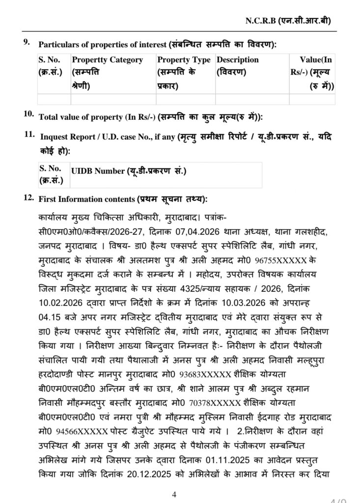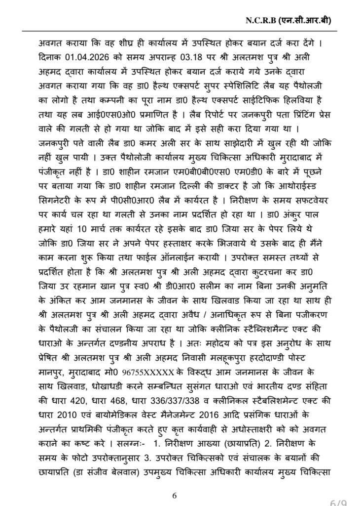 - Gandhi Nagar में बिना रजिस्ट्रेशन के चल रही थी ‘Dr. Health Expert Super Speciality Lab, संचालक अलतमश पर FIR दर्जउमेश लव, लव इंडिया, मुरादाबाद। थाना गलशहीद क्षेत्र में स्वास्थ्य विभाग और प्रशासन की संयुक्त कार्रवाई में एक बड़ी लापरवाही और धोखाधड़ी का खुलासा हुआ है। गांधी नगर स्थित ‘डॉ हेल्थ एक्सपर्ट सुपर स्पेशलिटी लैब’ बिना वैध पंजीकरण के संचालित पाई गई, जिस पर अब पुलिस ने मुकदमा दर्ज कर जांच शुरू कर दी है।…