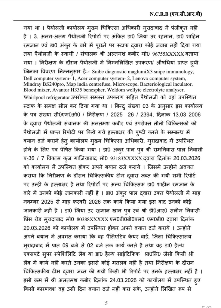 दिनांक 10 मार्च 2026 को अपर नगर मजिस्ट्रेट द्वितीय और स्वास्थ्य विभाग की टीम ने (डा. हैल्थ एक्सपर्ट सुपर स्पेशिलिटि लैब, गांधी नगर, मुरादाबाद) संयुक्त निरीक्षण किया। निरीक्षण के दौरान लैब मुख्य चिकित्सा अधिकारी (CMO) कार्यालय में पंजीकृत नहीं पाई गई। मौके पर मौजूद स्टाफ से लाइसेंस व रजिस्ट्रेशन के दस्तावेज मांगे गए, लेकिन उपलब्ध नहीं कराए गए। पैथोलॉजी रिपोर्ट्स पर अलग-अलग डॉक्टरों के नाम अंकित मिले, जिनकी पुष्टि नहीं हो सकी। निरीक्षण के दौरान पैथोलॉजी में अनस पुत्र श्री अली अहमद निवासी मल्हूपुरा हरदोदाण्डी पोस्ट मानपुर मुरादाबाद बीएमएलटी अन्तिम वर्ष का छात्र, शाने आलम पुत्र श्री अब्दुल रहमान निवासी मौहम्मदपुर बस्तौर मुरादाबाद बीएमएलटी एवं नमरा पुत्री श्री मौहम्मद मुस्लिम निवासी ईदगाह रोड मुरादाबाद पोस्ट ग्रैजुएट उपस्थित पाये गये।