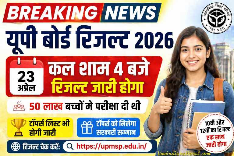 - UP Board Result 2026: कल शाम 4 बजे आएगा 10वीं-12वीं का रिजल्ट, ऐसे चेक Step-by-Stepलव इंडिया, लखनऊ / प्रयागराज। उत्तर प्रदेश माध्यमिक शिक्षा परिषद (UP Board) की 10वीं और 12वीं के छात्रों का इंतजार अब खत्म होने जा रहा है। यूपी बोर्ड का रिजल्ट 23 अप्रैल को शाम 4 बजे जारी किया जाएगा। 50 लाख छात्रों का इंतजार खत्म इस साल करीब 50 लाख छात्र-छात्राएं परीक्षा में शामिल हुए…
