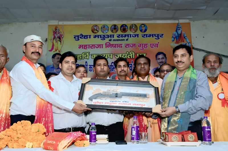 लव इंडिया, रामपुर। तुरैहा मछुआ समाज के तत्वाधान में 12 अप्रैल 2026 को जिला सहकारी बैंक सभागार में महाराजा निषादराज गुह जयंती एवं महर्षि कश्यप जन्मोत्सव का भव्य आयोजन किया गया। कार्यक्रम में समाज के सैकड़ों लोगों ने बढ़-चढ़कर भाग लिया और अपने महापुरुषों को श्रद्धांजलि अर्पित की।