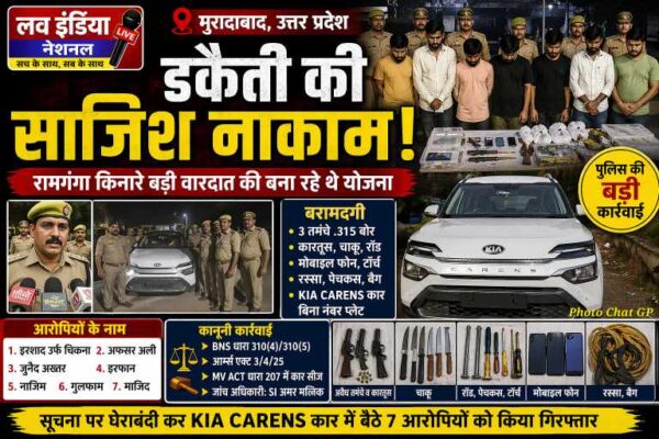 लव इंडिया, मुरादाबाद। कटघर कोतवाली क्षेत्र में पुलिस ने एक बड़ी कार्रवाई करते हुए डकैती की साजिश रच रहे 7 आरोपियों को गिरफ्तार किया है। आरोपियों के पास से अवैध हथियार, कारतूस, चाकू, मोबाइल फोन और वारदात में इस्तेमाल होने वाली KIA Carens कार बरामद की गई है। 🔎 कैसे मिली सूचना और क्या थी…