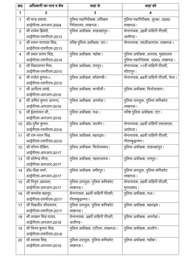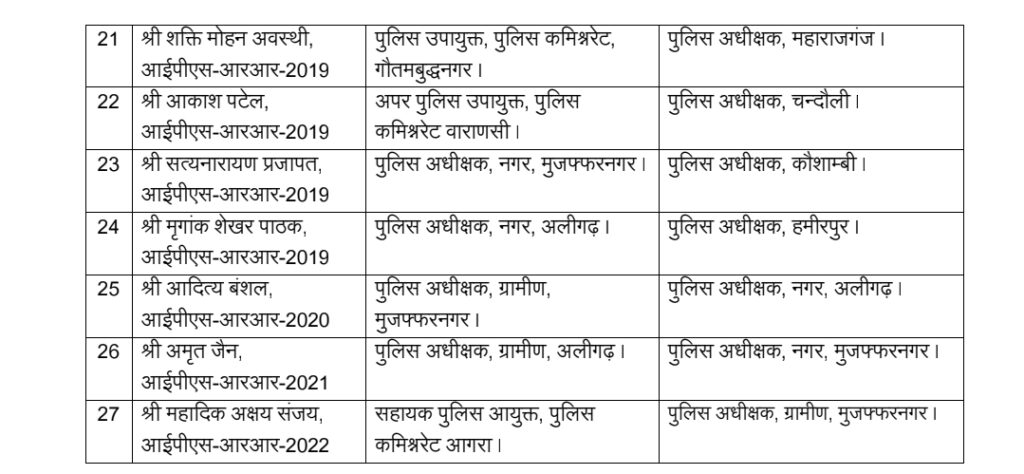 इसके अलावा कई अन्य अधिकारियों को पीएसी वाहिनियों, पुलिस कमिश्नरेट और मुख्यालय में महत्वपूर्ण जिम्मेदारियां दी गई हैं।