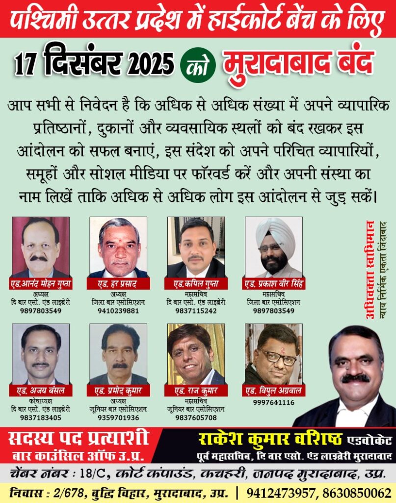 पश्चिमी यूपी के बार एसोसिएशन ने कई मौकों पर धरना, बंद, ज्ञापन आंदोलन किए हैं — जैसे 17 दिसंबर 2025 को मेरठ में शहर बंद का आह्वान भी हुआ। यह आंदोलन न्याय की पहुंच के मुद्दे पर व्यापक समर्थन के साथ हुआ है।